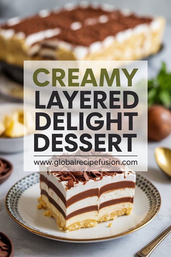 When serving Creamy Layered Delight at your gathering, you’ll want complementary offerings that balance its rich, sweet profile. A bitter coffee, like a medium-dark roast or espresso, cuts through the dessert’s creaminess perfectly. Hot tea works wonderfully too.