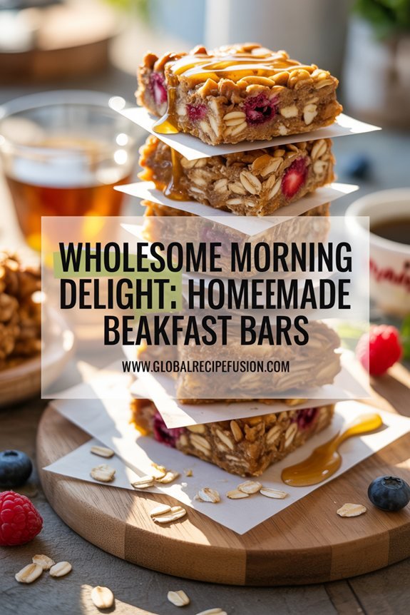 Try serving them alongside a cup of steaming coffee or tea, where the warm spices in the bars improve your brew’s aroma. For a complete breakfast, add a dollop of Greek yogurt drizzled with honey, creating a delightful contrast of textures.