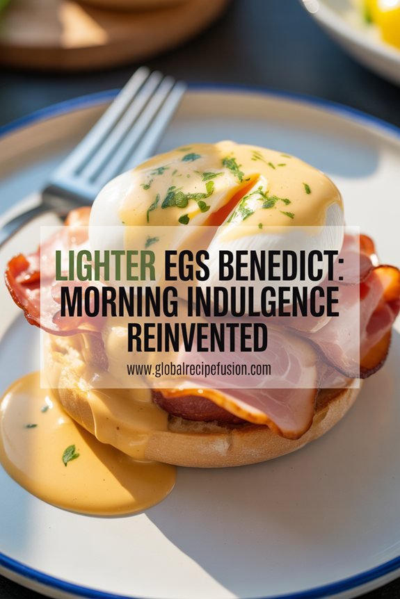 You’ll appreciate how the light sour cream (or yogurt) creates a velvety sauce that rivals traditional hollandaise, while slashing calories and fat considerably. The peameal bacon offers a leaner alternative to Canadian bacon, delivering that satisfying savory bite with less grease.