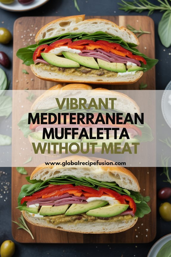 This meatless muffaletta sandwich draws inspiration from Mediterranean cuisine, featuring classic ingredients like kalamata olives, fresh parsley, and roasted red peppers, all layered on traditional focaccia bread for a vegetarian twist on the classic sandwich.