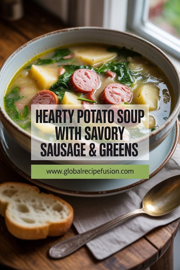 You’ll appreciate how the tender potato cubes soak up the rich chicken broth while the sausage adds a smoky depth that makes each spoonful satisfying.